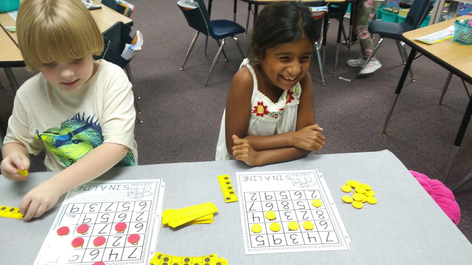 We have match centers every day. We spend 12 minutes at each center- Small Group, Technology, Application, Journals and Games. Each center is learning more about the current topic or a spiral review of previous topics. Our small groups are leveled, so the students are working with a peer at their same ability. This allows me to spend quality time helping the students who are struggling with a topic and provide enrichment for other students. We use a lot of hands on manipulatives to ensure that the students are grasping the math concepts. The students also work together in groups which allows them to act as teachers and guide their partner through an activity. We also take a lot of "games" and turn them in to math games- Addition Jenga, Addition Connect Four, Dominos, etc.